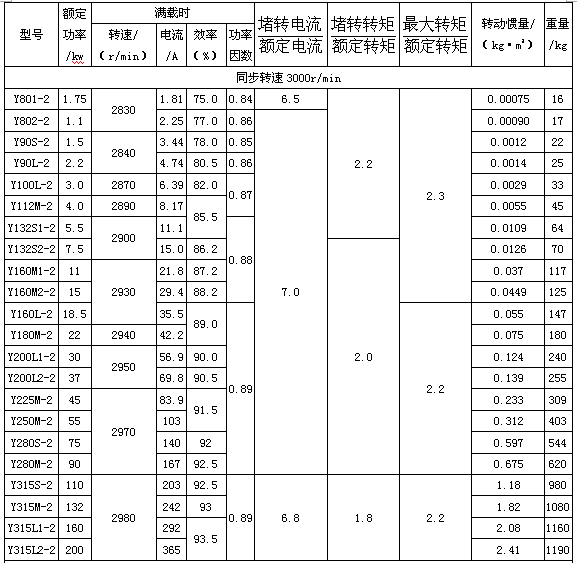 Y系列(IP44)三相異步電動機主要技術(shù)參數(shù)(同步轉(zhuǎn)速3000r/min)