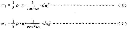 在設(shè)計階級,精確確定小、大錐齒輪的當(dāng)量質(zhì)量m1及m2是困難的。對常見的錐齒輪結(jié)構(gòu)?山频匾詣恿Ξ(dāng)量圓柱齒輪(見圖2)質(zhì)量來代替。于是,m1和m2可按公式(6)、(7)計算。