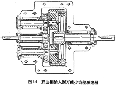雙曲柄機(jī)構(gòu)中,如果在兩根曲軸上都有動(dòng)力輸入,則“死點(diǎn)”位置也就自然不存在了。因此,可以通過一套定軸傳動(dòng)機(jī)構(gòu)把動(dòng)力從一輸入高速軸傳遞到另一高速軸,從而克服機(jī)構(gòu)“死點(diǎn)”。根據(jù)這種原理制成的雙曲柄輸入少齒差行星齒輪裝置之不理的類型很多,如太原工學(xué)院五十年代研制的雙曲柄輸入漸開線少齒差減速器(見圖1-4)、英國專利(見圖1-5)、、重慶鋼鐵公司研制的單齒環(huán)雙曲柄輸入少齒差減速器(見圖1-6)、日本松本和幸等人研制的RV減速器(見圖1-7)。其特點(diǎn)都是通過外嚙合齒輪副將輸入動(dòng)力分流、傳遞到多個(gè)曲柄軸上,形式多軸輸入,從而克服“死點(diǎn)”。這種結(jié)構(gòu)的特點(diǎn)是其傳動(dòng)比為定軸傳動(dòng)的傳動(dòng)比與少齒差行星齒輪傳動(dòng)的傳動(dòng)比之乘積,因而可以通過改變外嚙合齒輪的齒數(shù)方便函地滿足不同傳動(dòng)比的要求,適應(yīng)性強(qiáng)。其不足之處是結(jié)構(gòu)復(fù)雜,而且在高速軸之間存在兩平行傳動(dòng)的剛性傳動(dòng)鏈(外齒輪嚙合副和雙曲柄機(jī)構(gòu))對(duì)誤差比較敏感,加工精度要求很高。