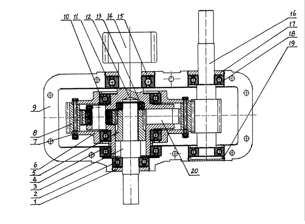 | 一種絞車差動(dòng)減速機(jī),由電機(jī)輸入軸、太陽(yáng)輪軸、太陽(yáng)輪、齒圈、行星輪、行星架、行星端蓋、外齒輪、箱體、軸承和油封組成,其特征在于:在箱體(9)上通過(guò)軸承(18)安裝電機(jī)輸入軸(16),通過(guò)軸承(2)安裝太陽(yáng)輪軸(3),通過(guò)軸承(4)(11)安裝行星架(12),在行星架(12)上通過(guò)軸承(13)安裝太陽(yáng)輪軸(3),通過(guò)軸承(10)安裝行星端蓋(6),齒圈(8)通過(guò)螺栓(7)安裝在行星端蓋(6)上,電機(jī)輸入軸(16)上的齒輪與齒圈(8)嚙合,行星輪(20)與齒圈(8)的內(nèi)齒輪和太陽(yáng)輪(5)嚙合,行星輪(20)與行星架(12)相連。 |