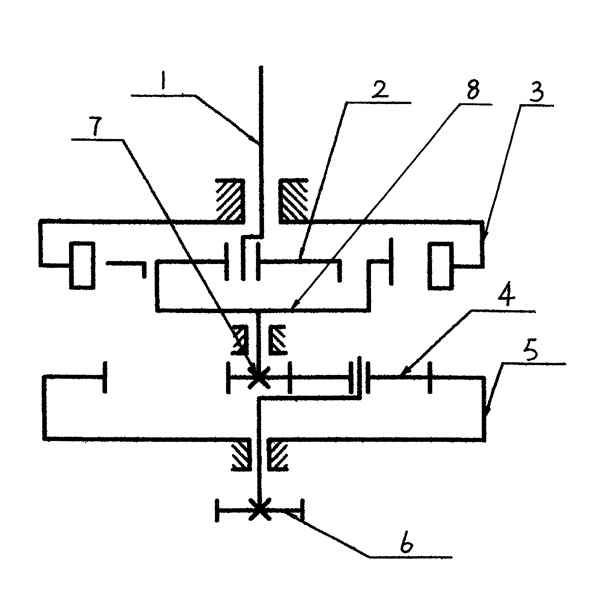 回轉(zhuǎn)減速機,主要由擺線針輪部份和行星齒輪部份組成,其特征在于:將擺線針輪的輸出機構(gòu)與行星齒輪部份中的輸入太陽輪固定連接,使擺線針輪的輸出部份和行星齒輪的輸入部份連接為一體。