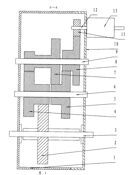 | 一種雙軸四減速減速機(jī),包括外殼體、外殼蓋、輸入軸、輸出軸、齒輪,其特征在于:外殼體上裝有平行的一軸、二軸、動力輸出軸,一軸上裝有一軸齒輪組甲和一軸齒輪組乙、兩組中至少有一組可以繞軸自由轉(zhuǎn)動,二軸上裝有二軸齒輪組甲和二軸齒輪組乙、兩組中至少有一組可以繞軸自由轉(zhuǎn)動,動力輸出軸上固定著輸出軸齒輪,外殼蓋上固定著輸入軸軸承座,輸入軸上固定著輸入軸齒輪,各齒輪組分別由大直徑齒數(shù)多的齒輪和小直徑齒數(shù)少的齒輪組成,輸入軸齒輪與一軸齒輪組甲的大直徑齒輪嚙合,一軸齒輪組甲的小直徑齒輪與二軸齒輪組甲的大直徑齒輪嚙合,二軸齒輪組甲的小直徑齒輪與一軸齒輪組乙的大直徑齒輪嚙合,一軸齒輪組乙的小直徑齒輪與二軸齒輪組乙的大直徑齒輪嚙合,二軸齒輪組乙的小直徑齒輪與輸出軸齒輪嚙合。 |