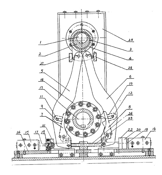 | 一種換向減速機(jī)包括殼體,換向裝置,主動(dòng)輪,被動(dòng)輪,輸出軸,輸入軸,其特征在上述所述的輸入軸(1)上固定偏心輪(2),偏心輪(2)外圓上有偏心軸承(3),偏心輪軸承(3)外圓上有拉板套(4),拉板套(4)上分別鉸連左拉板(5)、右拉板(6);左拉板(5)上鉸連左拉鉤(7),左拉鉤(7)上固定左拉鉤導(dǎo)塊(9);用左拉鉤導(dǎo)塊銷(11)與左拉板(5)鉸連;在右拉板(6)上鉸連右拉鉤(8),右拉鉤(8)上固定右拉鉤導(dǎo)塊(10)用右拉鉤導(dǎo)塊銷(12)與右拉板(6)鉸連,在輸出軸(13)上固定套筒滾子輪(14),在底板(26)上固定左程控液力缸(15)、右程控液力缸(16),左拉板導(dǎo)板(21),右拉板導(dǎo)板(22);在左程控液力缸(15)內(nèi)裝左柱塞(17),用左拉板鎖定器(19)與左拉板導(dǎo)板(21)連接,在右程控液力缸(16)內(nèi)裝有右柱塞(18),用右拉板鎖定器(20)與右拉板導(dǎo)板(22)連接,解鎖彈簧(24)套在推桿(23)上,拉板套(4)兩側(cè)設(shè)置有左限位板(27),右限位板(28)。 |