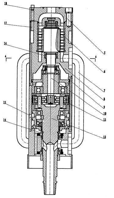 | 本實(shí)用新型屬于石化焦化塔除焦器的附助設(shè)備。提出的水渦輪減速機(jī)設(shè)置高壓水導(dǎo)流管,導(dǎo)流管為外置結(jié)構(gòu),其上端連通在高壓腔渦輪下部、下端連通輸出軸的出水口,高壓腔與低壓腔之間設(shè)置密封環(huán)。并在低壓腔殼體上有泄流孔。本實(shí)用新型提出的結(jié)構(gòu)設(shè)計(jì)合理,其設(shè)置的外置導(dǎo)流管可將高壓水導(dǎo)出,設(shè)置的密封件可防止水從高壓腔向低壓腔滲入,殼體壁上設(shè)置的泄流孔可將進(jìn)入低壓腔的少量水排出,保證整個(gè)減速機(jī)的長期可靠運(yùn)行。 |