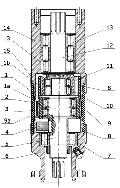 | 一種潛油泵專用減速機(jī),其主要結(jié)構(gòu)特征是雙聯(lián)行星齒輪安裝在輸入軸的偏心軸頸上,其下端的小齒輪與固定齒圈相嚙合,上端的齒圈與輸出軸上的小齒輪相嚙合,輸入軸的下端安裝在下接頭上,上端安裝在輸出軸上,輸出軸則安裝在上接頭上;由于偏心軸頸的作用,使行星齒輪在齒圈內(nèi)作既有公轉(zhuǎn)又有自轉(zhuǎn)的行星運(yùn)動,并帶動輸出軸上的小齒輪轉(zhuǎn)動,輸出軸即可將該轉(zhuǎn)速輸出。本實(shí)用新型可使用在深度大于1000米的深井中,并能在100℃-200℃的高溫下及10兆帕以上的高壓下穩(wěn)定運(yùn)轉(zhuǎn),其超載能力及耐熱、抗磨損性能均極強(qiáng),結(jié)構(gòu)簡單緊湊,生產(chǎn)成本較低。 |