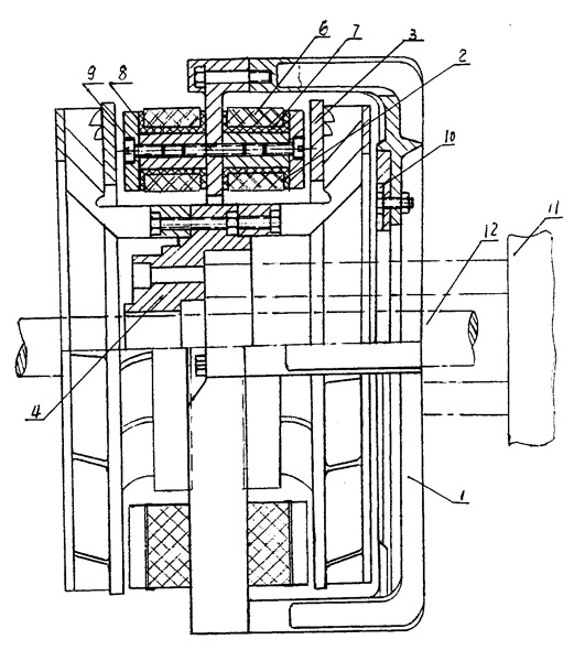 | 一種電渦流減速機(jī),由支架(1)、線(xiàn)圈固定盤(pán)(2)、葉輪(3)、軸套(4)和電氣控制箱(5)組成,其特征在于: a、線(xiàn)圈固定盤(pán)(2)包括線(xiàn)圈(6)和固定盤(pán)(7),線(xiàn)圈(6)固定于固定盤(pán)(7)的芯軸內(nèi),扇形板(8)、支架蓋(9)依次緊壓于固定盤(pán)(7); b、固定盤(pán)(7)通過(guò)法蘭盤(pán)(10)與支架(1)聯(lián)接為一體安裝于變速箱(11)上; c、軸套(4)裝于變速箱(11)的傳動(dòng)軸(12)上,一對(duì)葉輪(3)分別裝于軸套(4)兩邊上; d、線(xiàn)圈(6)由旋鈕開(kāi)關(guān)(13)與電氣控制箱(5)聯(lián)接。 |