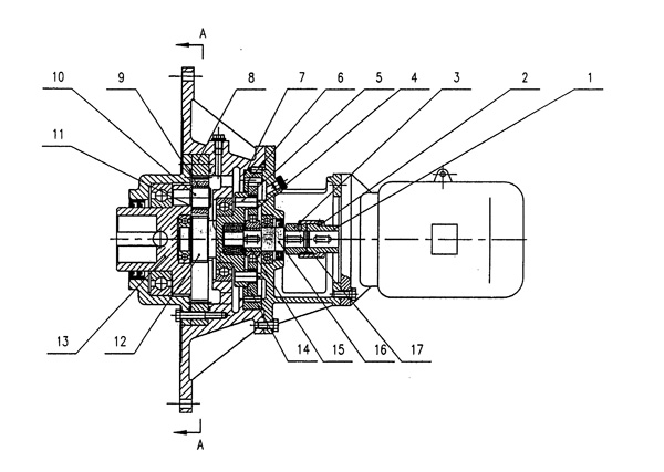 一種螺旋撈渣機專用減速機,包括由電機,以及安裝在機體內的針齒殼(7),與針齒殼(7)套裝的針齒銷(6),輸入軸(16),與偏心軸承(15)套裝的擺線輪(14)、偏心軸承(15)以及銷套(4)、銷軸(5)所組成的擺線針齒內嚙合行星傳動;其特征是:電機軸與輸入軸以及保險裝置連為一體,在電機軸上裝有電機套(1),減速機輸入軸(16)上裝有輸入軸套(3),將剪斷銷(17)裝入電機套(1)和輸入軸套(3)上的鍵槽內,并用剪斷銷固定套(2)將剪斷銷(17)固定;NGW型行星傳動結構由內齒圈(8),齒輪軸(12)和公用行星齒輪(9)以及輸出軸(13)組成,內齒圈(8)用螺栓固定在機體上,齒輪軸(12)的上部用一個大軸承固定在機體上,下部用一個小軸承固定在輸出軸(13)上,銅套(11)壓入行星齒輪(9)的孔內,并套入行星齒輪軸(10)上;內齒圈(8)與行星齒輪(9)相嚙合,行星齒輪(9)與齒輪軸(12)相嚙合;齒輪軸(12)是第一級傳動的輸出軸,通過軸承與輸出軸(13)連為一體;齒輪軸(12)帶動行星齒輪(9)轉動,內齒圈(8)固定不動,三個行星齒輪軸(10)套裝在輸出軸(13)上,第一級的輸出軸即齒輪軸(12)轉動時,帶動行星齒輪(9)轉動,由于行星齒輪(9)與內齒圈(8)相嚙合,內齒圈(8)固定不動,因此,行星齒輪(9)帶動輸出軸(13)轉動。