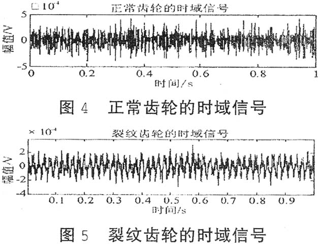 有限元仿真的正常齒輪的第10階固有頻率為708.17Hz,由采樣定理,取采樣頻率為2048Hz就可以了,采樣點(diǎn)數(shù)取為2048,輸入軸齒輪齒數(shù)z1=20,輸出軸齒輪齒數(shù)z2=30,輸入軸的回轉(zhuǎn)頻率為ƒr1=18.55Hz,因此嚙合頻率ƒm=371Hz。圖4和圖5分別給出了正常齒輪和裂紋齒輪(裂紋深度為4mm)的振動信號時(shí)域波形圖。