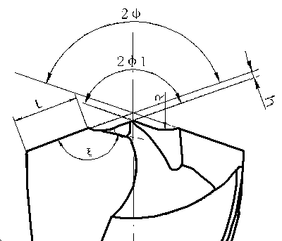 外刃鋒角2F過小時(shí)(2F<125°)難以磨出x=150~165°尖角。切屑易卷在容屑槽內(nèi),不宜排除。實(shí)踐經(jīng)驗(yàn)表明,2F=135°~140°,切屑流出方向逼近與鉆頭軸線平行,有利排屑。而且容易形成較大的x角,控制出現(xiàn)“6”字屑。