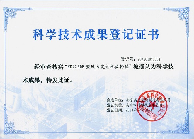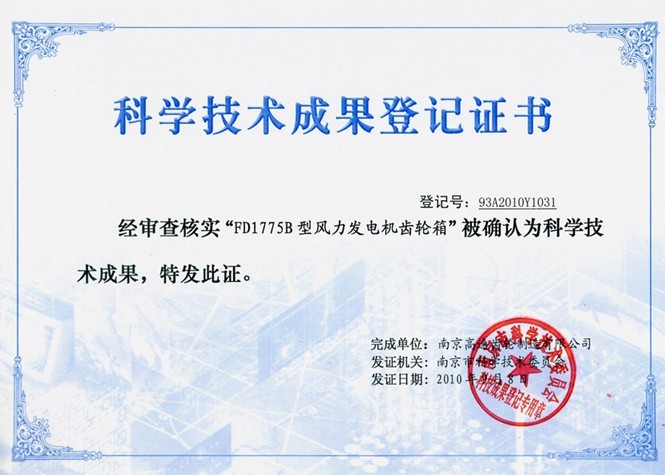 2010年8月26日,在南京高速齒輪制造有限公司(以下簡(jiǎn)稱:高速公司)400畝廠區(qū),召開了“ FD1775B、FD2250B型風(fēng)力發(fā)電機(jī)齒輪箱”科技成果鑒定會(huì)。會(huì)議邀請(qǐng)了南京理工大學(xué)、南京航空航天大學(xué)、東南大學(xué)、南京市江寧區(qū)科技局等單位的專家、領(lǐng)導(dǎo)組成了鑒定委員會(huì)。鑒定委員會(huì)聽取了高速公司的項(xiàng)目研制工作總結(jié)等報(bào)告,審查了相關(guān)技術(shù)文件,考察了生產(chǎn)現(xiàn)場(chǎng)。最終一致認(rèn)為高速公司研制的兩項(xiàng)產(chǎn)品總體技術(shù)水平達(dá)到了國(guó)際同類產(chǎn)品先進(jìn)水平,同意通過科技成果鑒定,并希望進(jìn)一步擴(kuò)大國(guó)內(nèi)外市場(chǎng)。