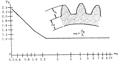 計算分析表明,當(dāng)齒輪的輪緣厚度SR相對地小于輪齒全齒高ht時(SR及ht意義見C1),輪齒的齒根彎曲應(yīng)力將明顯增大。光彈實驗和有限元分析均指出:當(dāng)輪緣齒高比mB=SR/ht≥2.0時,mB對齒根彎曲應(yīng)力沒有影響。在mB=1.0~2.0區(qū)間,齒根彎曲應(yīng)力開始增大。圖C1是經(jīng)分析歸納得出輪緣系數(shù)YB與輪緣高比mB的關(guān)系曲線,它由以mB=1.0和1.56為折點的三段直線組成。