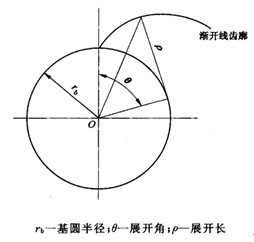 平面沿著一個(gè)固定的圓柱(基圓柱)作純滾動(dòng)時(shí),該平面上一條定直線(發(fā)生線)所展成的軌跡稱為圓柱的漸開線齒面;鶊A柱被垂直于軸線的平面所截的圓稱為基圓,基圓半徑以rb表示;漸開線齒面被垂直于基圓柱軸線的平面所截的曲線稱為漸開線齒廓(見圖2)。