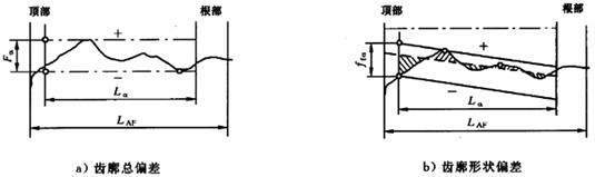 在被測(cè)軸截面上(垂直于基圓柱軸線的截面)齒廓評(píng)定范圍內(nèi),包容實(shí)際齒廓線的兩條最近的理論齒廓線(圖中點(diǎn)劃線)間的距離,在理論齒廓線的法線方向計(jì)值,以Fα表示(見圖3a)。