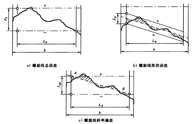 在被測(cè)圓柱面上,過評(píng)定范圍兩端交平均螺旋線A、B兩點(diǎn)的兩條理論螺旋線間的差值以fHβ表示(見圖6c)。