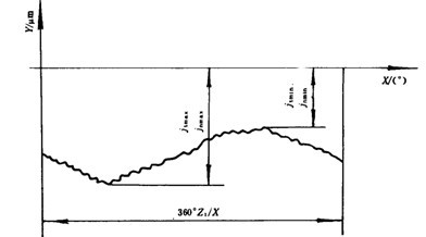 雙嚙法測量的側(cè)隙在帶零線的徑向綜合誤差曲線(圖47)上取值。X軸就是零線,X坐標(biāo)代表大齒輪的回轉(zhuǎn)角,Y坐標(biāo)代表側(cè)隙。曲線在X坐標(biāo)360°范圍內(nèi),Y坐標(biāo)的最小負(fù)值為jn min(或jt min),最大負(fù)值為jn min(或jt min)。