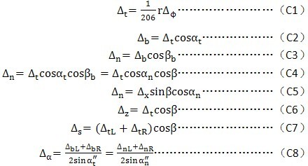 C2齒輪各項(xiàng)誤差應(yīng)按下述規(guī)定的方向計(jì)值:Δfpb、ΔFb、ΔFpX、Δffβ、ΔFw、ΔEwm、jn在齒面法線方向計(jì)值;ΔFi′、Δfi′、ΔFp、ΔFpk、Δfpt、ΔFβ、ΔFic′、Δfic′、jt在分度圓切線方向計(jì)值;Δff在基圓切線方向計(jì)值;ΔFr、ΔFi″、Δfi″、ΔEα″和ΔEH在雙側(cè)齒面徑向計(jì)值;ΔEs在雙側(cè)齒面分度圓螺旋線的法線方向計(jì)值。