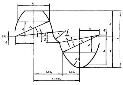 雙圓弧圓柱齒輪基本齒廓的形狀和尺寸參數(shù)按下圖和表中的規(guī)定。