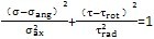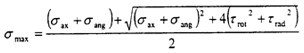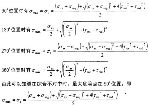 此時的應(yīng)力情況屬于三向應(yīng)力狀態(tài),所以其分析過程和徑向不對中900以及2700以情況相似,只是這里還有了附加的軸向拉應(yīng)力和附加的角向應(yīng)力,將各個應(yīng)力值σxx=σax+σang,σyy=0,σzz=0,τxy=τrot,τyz=0,τzx=τrad分別代入式(4-29)(4-30)(4-31)中,可以得到