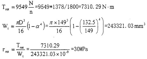 根據(jù)實(shí)際情況計算出工作時的剪應(yīng)力:GK2型內(nèi)燃機(jī)車啟動發(fā)電機(jī)ZQF-38TH,115V,38KW,1170~358Or/min;GK2型內(nèi)燃機(jī)機(jī)用柴油機(jī)型號為MTU16V396TC14,持續(xù)功率為1378KW,旋轉(zhuǎn)角速度為18O0rod/min。柴油機(jī)冷區(qū)液溫度為40℃時最小啟動轉(zhuǎn)矩包括加速余量約8OON.m,曲軸扭矩約75ON.m