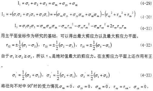 該方程有三個實(shí)根,分別為σ1,σ2,σ3,且有σ1≥σ2≥σ3,此三個應(yīng)力即為分別作用于三個相互垂直平面上的主應(yīng)力值,并且在此三個平面上無剪切應(yīng)力。當(dāng)坐標(biāo)變換時,雖然每個應(yīng)力分量都隨之改變,但是有些量是不變的,Il,I2,I3分別為第一,第二,第三應(yīng)力不變量。