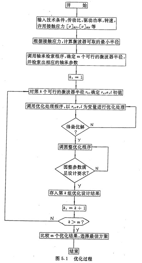 由于激波器一般使用通用軸承,所以激波器半徑Tb應(yīng)結(jié)合軸承標(biāo)準(zhǔn)來選擇。在程序中,先給各傳動(dòng)參數(shù)指定其取值范圍的中間數(shù)值,然后根據(jù)接觸應(yīng)力計(jì)算,確定滿足強(qiáng)度條件的最小激波器半徑,由軸承檢索程序,確定若干個(gè)可行的激波器半徑。在確定可行的激波器半徑時(shí),為了使減速器外徑尺寸不致過大,僅把與應(yīng)力計(jì)算結(jié)果相近的軸承半徑及其相鄰型號(hào)半徑作為可行的激波器半徑。對(duì)每一個(gè)可行的激器半徑Tb,調(diào)用優(yōu)化子程序以TZ,e,l為優(yōu)化變量進(jìn)行優(yōu)化處理。其算法流程如圖5.1所示。