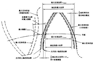 對(duì)于任何檢測(cè)方法所規(guī)定的最大齒厚必須減小,以便確保徑向跳動(dòng)及其他切齒時(shí)變化對(duì)檢測(cè)結(jié)果的影響,不致增加最大實(shí)效齒厚,規(guī)定的最小齒厚也必須減小,以便使所選擇的齒厚公差能實(shí)現(xiàn)經(jīng)濟(jì)的齒輪制造,且不會(huì)被來(lái)源于精度等級(jí)的其他公差所耗盡。