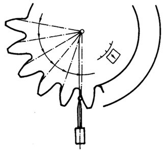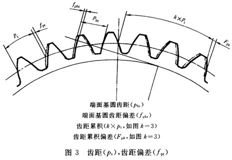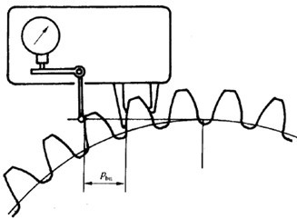 當(dāng)各齒通過(guò)嚙合時(shí),單個(gè)齒距偏差在切向綜合位移圓弧上有累積作用。這種影響在切向綜合偏差圖上看得很清楚,這樣,可確定齒距累積偏差值,(比如k=2.3,…)即在適當(dāng)數(shù)量的齒距間測(cè)頂點(diǎn)切線的縱坐標(biāo)。圖28中表示了單個(gè)齒距偏差、單個(gè)齒距和齒廓組合偏差以及近似的齒距累積總偏差。