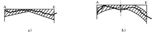 在線圖中,未修整齒面的螺旋線跡線是用一條直線來(lái)表示,而鼓形齒的齒面其相應(yīng)的跡線是弓形曲線,在線圖中,鼓形齒齒面的設(shè)計(jì)螺旋線和平均螺旋線變線通常是拋物線(見(jiàn)圖23)。
