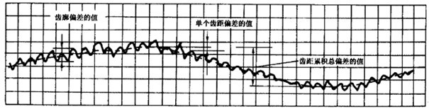切向綜合偏差的記錄圖,包括齒輪和測(cè)量齒輪嚙合作完整圈旋轉(zhuǎn)數(shù)的長(zhǎng)周期成分,和加在其上的各齒相繼嚙合的短周期成分。