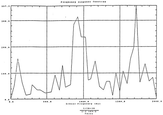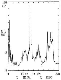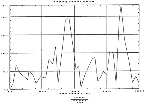 有了脈沖激勵(lì)信號和脈沖響應(yīng)信號后,CF-355頻譜分析儀就能計(jì)算出測點(diǎn)12X向由于14點(diǎn)X向激勵(lì)間的頻響函數(shù)H(ω)及其相干函數(shù),如圖4-5所示。圖4-6是頻響函數(shù)H(ω)的倒數(shù)。
