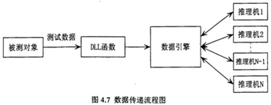 根據(jù)流程圖可知,從故障測試數(shù)據(jù)到數(shù)據(jù)引擎,有兩種數(shù)據(jù)處理方式,一種是故障測試數(shù)據(jù)由數(shù)據(jù)采集系統(tǒng)采集后,可先進行預處理,將故障信號數(shù)據(jù)處理為推理機所需的故障特征數(shù)據(jù),然后發(fā)送出去,動態(tài)連接庫DLL函數(shù)則通過網(wǎng)絡(luò)接收這些故障特征數(shù)據(jù),同時對照推理機向數(shù)據(jù)引擎申請的故障特征變量,將申請的故障特征變量對應(yīng)的值找出,按數(shù)據(jù)引擎規(guī)定的格式反送給申請數(shù)據(jù)的推理機。另一種是故障測試數(shù)據(jù)由數(shù)據(jù)采集系統(tǒng)采集后,按一定格式直接發(fā)送出去,動態(tài)連接庫DLL函數(shù)則通過網(wǎng)絡(luò)接收這些故障信息數(shù)據(jù),然后再進行數(shù)據(jù)預處理,將故障信息數(shù)據(jù)處理為推理機所需的故障特征數(shù)據(jù),同時對照推理機向數(shù)據(jù)引擎申請的故障特征變量,將申請的故障特征變量對應(yīng)的值找出,再按數(shù)據(jù)引擎規(guī)定的格式反送給申請數(shù)據(jù)的推理機。