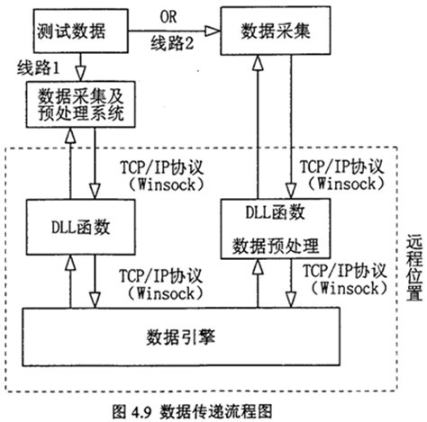 網(wǎng)絡(luò)化遠程故障診斷的實現(xiàn),其關(guān)鍵是遠程數(shù)據(jù)的傳送、存貯及數(shù)據(jù)交換處理。故障診斷系統(tǒng)遠離故障設(shè)備現(xiàn)場,只要故障現(xiàn)場故障測試數(shù)據(jù)能即時通過網(wǎng)絡(luò)傳送到故障診斷系統(tǒng)中,故障診斷系統(tǒng)即能實現(xiàn)網(wǎng)絡(luò)化遠程故障診斷。當智能故障診斷中的推理機進行推理時,通過數(shù)據(jù)引擎向動態(tài)連接庫DLL函數(shù)申請數(shù)據(jù),這些數(shù)據(jù)是推理時需要的故障特征參數(shù)變量值。動態(tài)連接庫DLL函數(shù)則通過網(wǎng)絡(luò)直接從故障現(xiàn)場測試采集計算機中得到故障信息數(shù)據(jù)。數(shù)據(jù)傳送流程圖如圖4.9 所示。