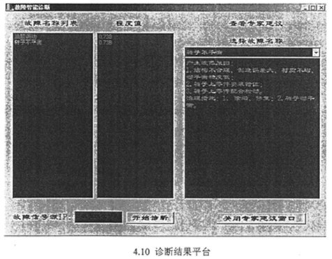 根據(jù)給出的數(shù)據(jù)端口及數(shù)據(jù)格式,即可按用戶的要求設(shè)計診斷結(jié)果輸出平臺。診斷結(jié)果應(yīng)給出診斷故障的名稱、故障發(fā)生的部位,故障發(fā)生的時間及程度。對于不同的故障,提示故障發(fā)生的可能原因,給出相應(yīng)的專家建議或維修方法等。圖4.10為本文集成系統(tǒng)的診斷結(jié)果輸出用戶界面。圖4.11為本文集成系統(tǒng)的專家知識庫建立及診斷推理平臺。