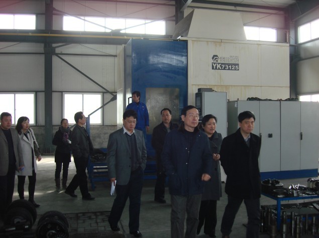 韓祝強(qiáng)縣長、張軍會(huì)長、劉占坤總經(jīng)理在大型數(shù)控磨齒機(jī)旁