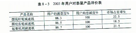 公司董事長張國林提出并率先在泰星減速機(jī)股份有限公司全面推行的以“三改、三制、三化”為主線的一系列的管理理念、管理模式、管理方法、運(yùn)行機(jī)制和創(chuàng)新機(jī)制,不僅對公司的內(nèi)部管理產(chǎn)生了巨大的成效,取得了很好的企業(yè)效益,且得到了社會的廣泛認(rèn)可,產(chǎn)生了很好的社會效應(yīng)和一定的理論效應(yīng)。 I 推動企業(yè)發(fā)展 創(chuàng)造了超一流的產(chǎn)品 泰星減速機(jī)股份有限公司正是認(rèn)真貫徹了公司董事長張國林的“一保產(chǎn)品質(zhì)量,二保供貨期”的質(zhì)量思想,在企業(yè)員工中形成了一種“用戶在我心中、質(zhì)量在我手中、用戶的需求就是我們的追求、用戶滿意才有我們的滿意”的質(zhì)量共識,為用戶提供了國內(nèi)領(lǐng)先、國際一流的高質(zhì)量的產(chǎn)品。 泰星產(chǎn)品的高質(zhì)量體現(xiàn)在:代表主要產(chǎn)品質(zhì)量水平的主要技術(shù)指標(biāo)遠(yuǎn)遠(yuǎn)超過了同行業(yè)的最佳水平。見表8—1。 主要產(chǎn)品的質(zhì)量指標(biāo)遠(yuǎn)遠(yuǎn)超過了國內(nèi)的最好水平。主要產(chǎn)品的質(zhì)量水平見表8—2。 到2004年泰星減速機(jī)股份有限公司的產(chǎn)品合格率連續(xù)11年達(dá)到100%,一等品率2004年達(dá)到95.3%,優(yōu)等品率達(dá)到72.50%。 泰星公司生產(chǎn)的產(chǎn)品噪音低,無污染,環(huán)境指標(biāo)達(dá)到了國內(nèi)的同行業(yè)的領(lǐng)先水平。  增強(qiáng)了研發(fā)能力 公司董事長張國林認(rèn)識到:“技術(shù)創(chuàng)新是企業(yè)發(fā)展的關(guān)鍵。沒有先進(jìn)的技術(shù),先進(jìn)的設(shè)備和工藝,就不可能生產(chǎn)出質(zhì)量過硬的產(chǎn)品,企業(yè)也無法立足于市場,擴(kuò)大規(guī)模,企業(yè)發(fā)展也就成為一句空話”。因此,董事長張國林非常重視企業(yè)科技開發(fā)工作,一方面,不斷加大公司的科技研發(fā)費(fèi)用的投人,早在2000年泰星減速機(jī)股份有限公司的研究與開發(fā)費(fèi)用已經(jīng)占到公司當(dāng)年銷售收入的9.7%,遠(yuǎn)遠(yuǎn)超過了國內(nèi)同行業(yè)企業(yè)的先進(jìn)水平,已經(jīng)接近國外大型跨國公司10%的最好水平,泰星股份公司的研究與開發(fā)費(fèi)用還在以每年20%的速度在增長;另一方面,為了提高企業(yè)的技術(shù)研發(fā)能力,泰星股份公司于1998年初就成立了減速機(jī)研究所,研究所取得了豐碩的科研成果,他們自主設(shè)計(jì)、自主研制、自主開發(fā)的9000系列擺線釷輪減速機(jī)、9000系列硬齒面減速機(jī)、9000系列中硬齒面減速機(jī)達(dá)到了國際21世紀(jì)先進(jìn)水平。 營造了整潔的工作環(huán)境 泰星股份公司董事長張國林認(rèn)為:一方面,優(yōu)美的廠區(qū)環(huán)境,是企業(yè)領(lǐng)導(dǎo)層富有戰(zhàn)略眼光的重要反映,也是企業(yè)形象和職工精神面貌的綜合體現(xiàn)。它有利于避免因外部環(huán)境干擾而引起的不良心理和生理現(xiàn)象,激發(fā)職工的勞動熱情,提高勞動生產(chǎn)率;另一方面,公司的員工每天要在公司工作八個(gè)小時(shí),公司、工廠、車間的環(huán)境美化了,能為員工營造一個(gè)舒適的工作環(huán)境,保證員工心情愉快,使員工處在一種愉悅的工作狀態(tài)中,這樣也有利于產(chǎn)品質(zhì)量的提高。因此,按照定制工藝的要求,本著使人機(jī)物處于最佳優(yōu)化組合狀態(tài)的原則,對公司的各個(gè)部門,車間內(nèi)部進(jìn)行了合理的平面布置,并重點(diǎn)抓了“兩通”“三化”工程建設(shè),不僅保證了車間內(nèi)的工作環(huán)境清潔、整齊,且使整個(gè)廠區(qū)布局合理、美麗、整潔。難怪國外的 同行來星股份公司考察時(shí),發(fā)出了這樣的贊嘆:“簡直就是一座花園式的工廠”。 形成了愛廠如家的工作熱情 沒有工作制度,沒有任何約束,員工自愿一天為企業(yè)工作14個(gè)小時(shí)。這種工作熱情在目前的市場經(jīng)濟(jì)社會中是罕見的。泰星公司員工的這種工作熱情來源于張國林董事長提出的“能上能下,競爭上崗:實(shí)績計(jì)酬”,“生活溫暖化”等一系列管理理念、管理方法在太星中的推行張董事長的這些管理理念與管理方法的實(shí)施,在企業(yè)內(nèi)部為員工們創(chuàng)造了一種發(fā)揮自己的才能,發(fā)揮自已的水平:一切憑實(shí)績講話,~切憑數(shù)據(jù)講話的氛圍。讓員工們也感受到了為企業(yè)工作的甜頭,感受到了他們的切身利益是與企業(yè)的榮辱:興衰密不可分的。因此,員工們愿意也樂意為企業(yè)工作。 創(chuàng)造了領(lǐng)先同行業(yè)十年的輝煌業(yè)績 由于董事長張國林治企有方,使泰星公司得到了快速的發(fā)展。在1993年,衡量公司經(jīng)濟(jì)效益的主要指標(biāo):資金利潤率、銷售利潤率、成本費(fèi)用利潤率、總資產(chǎn)貢獻(xiàn)率、流動資金周轉(zhuǎn)率、全員勞動生產(chǎn)率:產(chǎn)品銷售率、質(zhì)量損失率、新產(chǎn)品產(chǎn)值率以及萬元總產(chǎn)值綜合能耗均保持在全國同行業(yè)的領(lǐng)先水平。 在2003年泰星股份公司的主要經(jīng)濟(jì)效益指標(biāo)分別為:總資產(chǎn)零獻(xiàn)率為29.25%,資本保值增值率127.83%,資金周轉(zhuǎn)率2.64次,成本費(fèi)用利潤17.33%,全員勞動產(chǎn)生產(chǎn