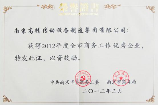 南高齒獲2012年度南京市商貿(mào)工作優(yōu)秀企業(yè)稱號(hào)
