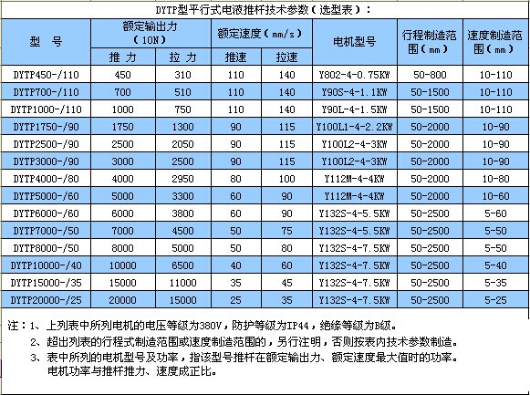 電液推桿主要是由推桿的型式、電機(jī)的防護(hù)等級(jí)、額定輸出力、行程、額定速度和使用角度等六大基本要素組成,還可根據(jù)擁護(hù)特殊要求,配套三種調(diào)節(jié)功能,即:速度調(diào)節(jié)推、拉力調(diào)節(jié),行程調(diào)節(jié)(行程開(kāi)關(guān)定位)。除上述三種調(diào)節(jié)功能定貨時(shí)必須文字注明外,其他請(qǐng)參照型號(hào)編制方式,認(rèn)真填寫(xiě)六大要素。 DYTP型平行式電液推桿技術(shù)參數(shù)(選型表)