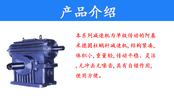 本系列減速機為單級傳動的阿基米德圓柱蝸桿減速機,結構緊湊,體積小,重量輕,傳動平穩(wěn)、靈活,無沖擊無噪音,具有自鎖作用,使用方便。適用于化工、冶金、礦山、紡織、食品、醫(yī)藥等行業(yè)的各種機械設備上。