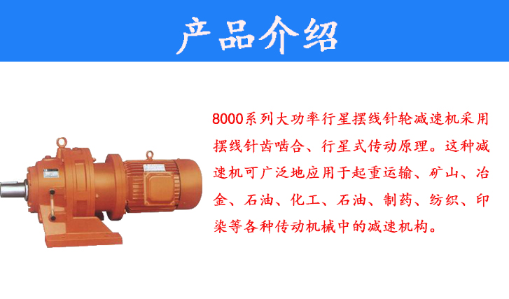 8000系列大功率行星擺線針輪減速機(jī)采用擺線針齒嚙合、行星式傳動原理。這種減速機(jī)可廣泛地應(yīng)用于起重運(yùn)輸、礦山、冶金、石油、化工、石油、制藥、紡織、印染等各種傳動機(jī)械中的減速機(jī)構(gòu)。