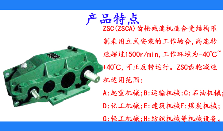 ZSC(ZSCA)齒輪減速機(jī)適合受結(jié)構(gòu)限制采用立式安裝的工作場合,高速轉(zhuǎn)速超過1500r/min,工作環(huán)境為-40℃~+40℃,可正反轉(zhuǎn)運(yùn)行。