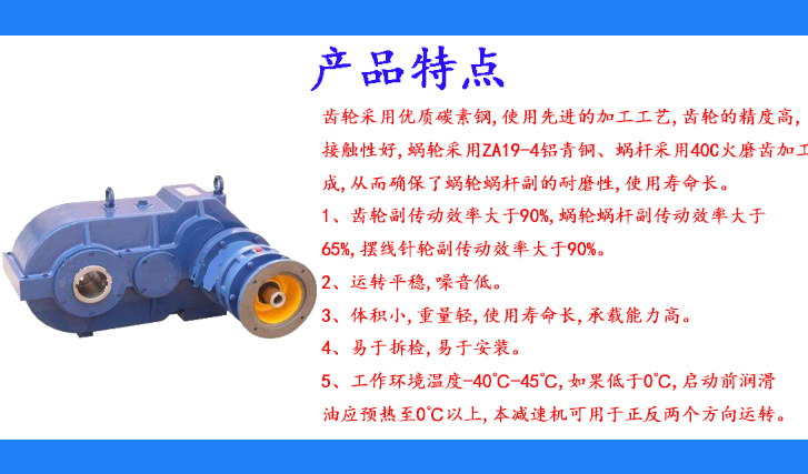 齒輪采用優(yōu)質(zhì)碳素鋼,使用先進(jìn)的加工工藝,齒輪的精度高,接觸性好,蝸輪采用ZA19-4鋁青銅、蝸桿采用40C火磨齒加工而成,從而確保了蝸輪蝸桿副的耐磨性,使用壽命長(zhǎng)。