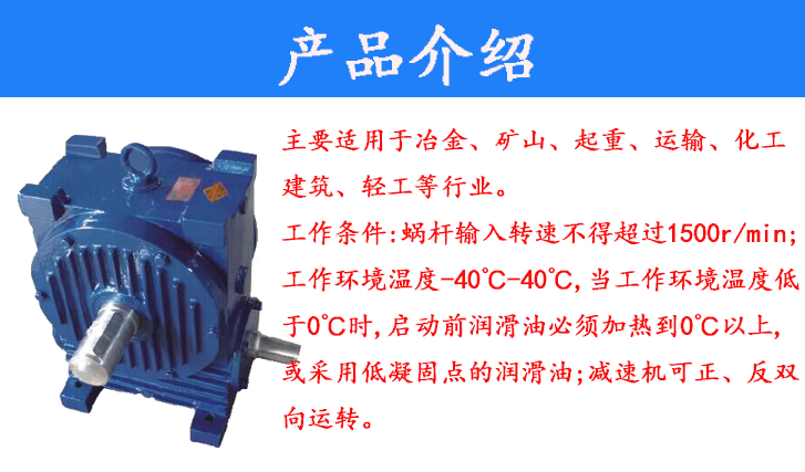 主要適用于冶金、礦山、起重、運(yùn)輸、化工、建筑、輕工等行業(yè)。工作條件:蝸桿輸入轉(zhuǎn)速不超過1500r/min;工作環(huán)境溫度為-40~40℃,當(dāng)工作環(huán)境溫度低于0℃時(shí),啟動(dòng)前潤滑油必須加熱到0℃以上,或采用低凝固點(diǎn)的潤滑油;減速器可正、反雙向運(yùn)轉(zhuǎn)。