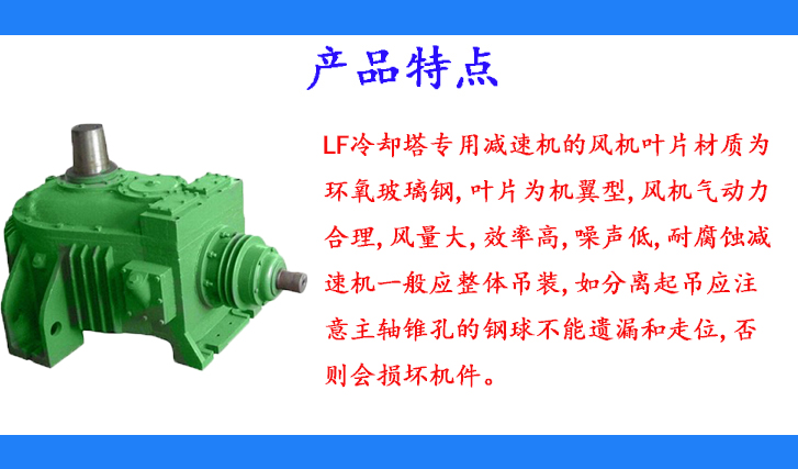 LF冷卻塔專(zhuān)用減速機(jī)的風(fēng)機(jī)葉片材質(zhì)為環(huán)氧玻璃鋼,葉片為機(jī)翼型,風(fēng)機(jī)氣動(dòng)力合理,風(fēng)量大,效率高,噪聲低,耐腐蝕減速機(jī)一般應(yīng)整體吊裝,如分離起吊應(yīng)注意主軸錐孔的鋼球不能遺漏和走位,否則會(huì)損壞機(jī)件。