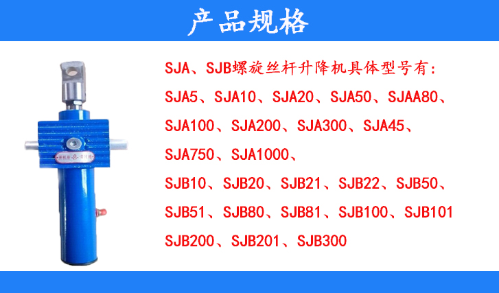 SJA、SJB螺旋絲桿升降機具體型號有:SJA5、SJA10、SJA20、SJA50、SJA80、SJA100、SJA200、SJA300、SJA450、SJA750、SJA1000