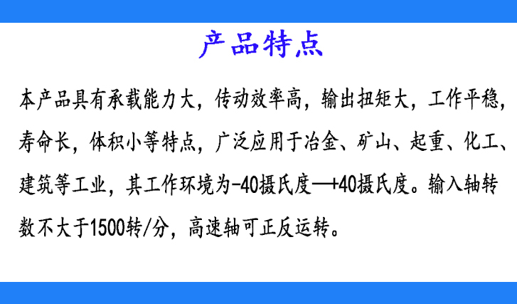 本產(chǎn)品具有承載能力大,傳動(dòng)效率高,輸出扭矩大,工作平穩(wěn),壽命長(zhǎng),體積小等特點(diǎn),廣泛應(yīng)用于冶金、礦山、起重、化工建筑等行業(yè),其工作環(huán)境為-40℃-+40℃。輸入軸轉(zhuǎn)數(shù)不大于1500轉(zhuǎn)/分,高速軸可正反運(yùn)轉(zhuǎn)。