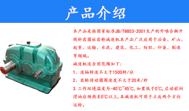 本產(chǎn)品是按國家標(biāo)準(zhǔn)JB/T8853-2001生產(chǎn)的外嚙合漸開線斜齒圓柱齒輪減速機本產(chǎn)品廣泛應(yīng)用于冶金、礦山、起重、運輸、水泥、建筑、化工、紡織、印染、制造等領(lǐng)域。減速機適合用范圍如下:1,速軸轉(zhuǎn)速不大于1500轉(zhuǎn)/分2齒輪傳動圓周速度不大于20米/秒。3.工作環(huán)境溫度為-40℃~45℃,如果低于0℃,啟動前潤滑油應(yīng)預(yù)熱至0℃以上,本減速機可用于正反兩個方向運轉(zhuǎn)