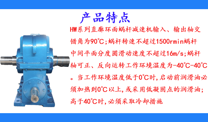HW系列直廓環(huán)面蝸桿減速機(jī)輸入、輸出軸交錯角為90℃;蝸桿轉(zhuǎn)速不超過1500rmin蝸桿中間平面分度圓滑動速度不超過16m/s;蝸桿軸可正、反向運(yùn)轉(zhuǎn)工作環(huán)境溫度為-40℃-40℃。當(dāng)工作環(huán)境溫度低于0℃時,啟動前潤滑油必須加熱到0℃以上,或采用低凝固點(diǎn)的潤滑油;高于40℃時,必須采取冷卻措施