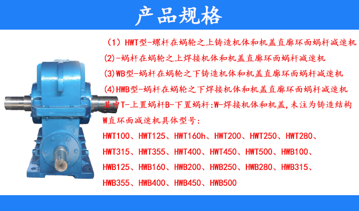 HW直廓環(huán)面減速機(jī)具體型號:HWT100、HWT125、HWT160、HWT200、HWT250、HWT280、HWT315、HWT355、HWT400、HWT450、HWT500