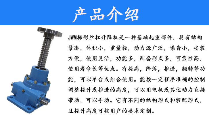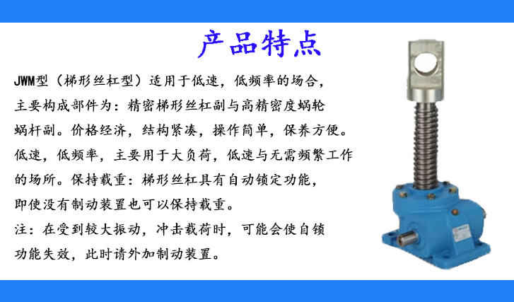 1、JWM型(梯形絲杠型)適用于低速、低頻率的場(chǎng)合,主要構(gòu)成部件為:精密梯形絲杠副與高精密度蝸輪蝸桿副。