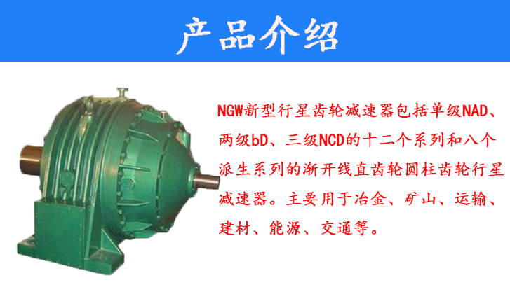 NGW新型行星齒輪減速器包括單級(jí)NAD、兩級(jí)NBD、三級(jí)NCD的十二個(gè)系列和八個(gè)派生系列的漸開線直齒輪圓柱齒輪行星減速器。